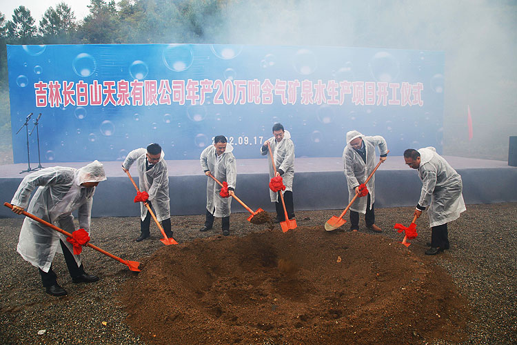 9月17日,集团公司在吉林省抚松县抚松镇碱厂沟仙人泉水源地举行吉林长白山天泉公司年产20万吨含气水项目开工仪式。集团公司党委书记、董事长王树平,抚松县委书记曾钒胜致辞。白山市委常委、常务副市长张铁明出席仪式。