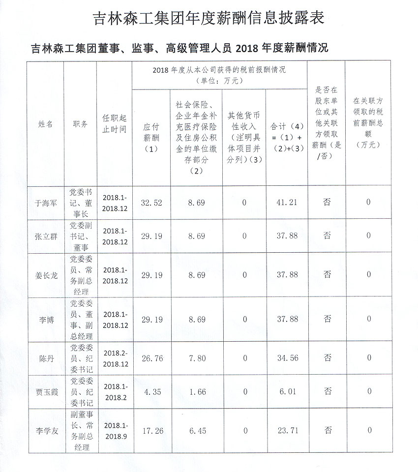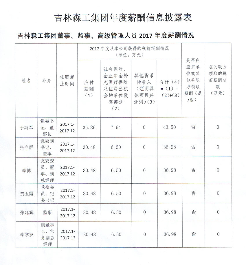 吉林森工集团2017、2018年度企业负责人薪酬信息披露