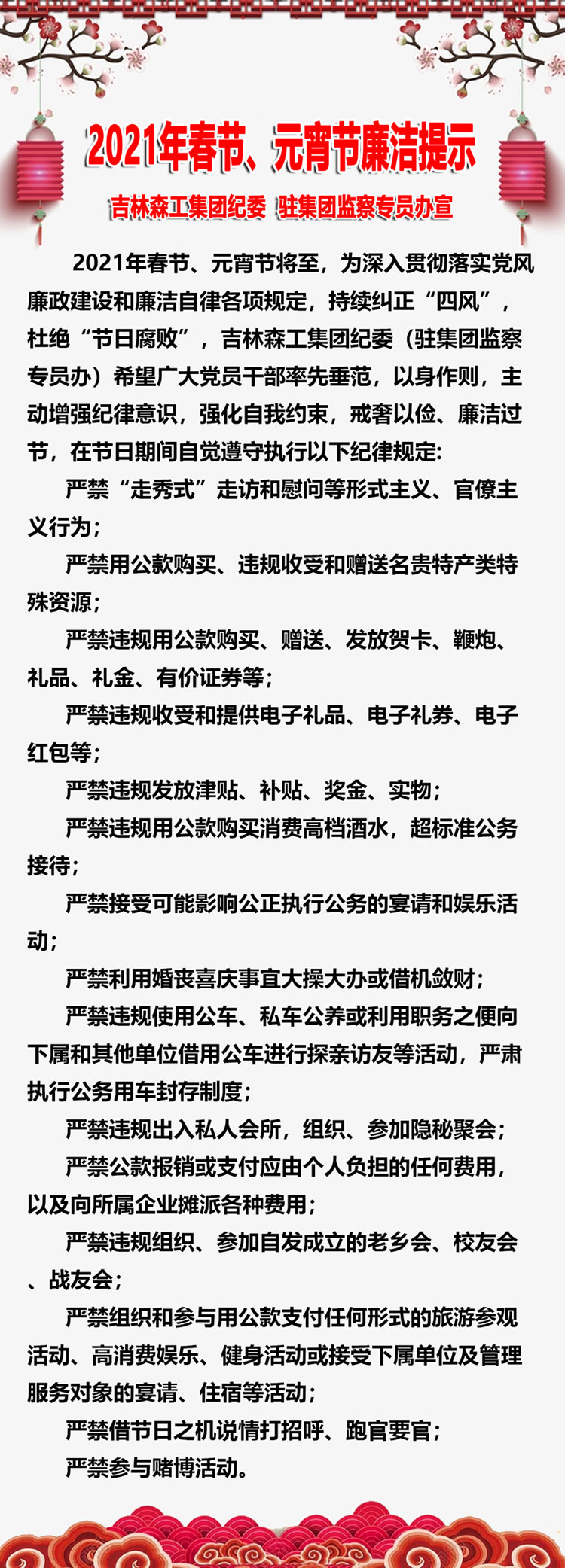吉林森工集团2021年春节、元宵节廉洁提示