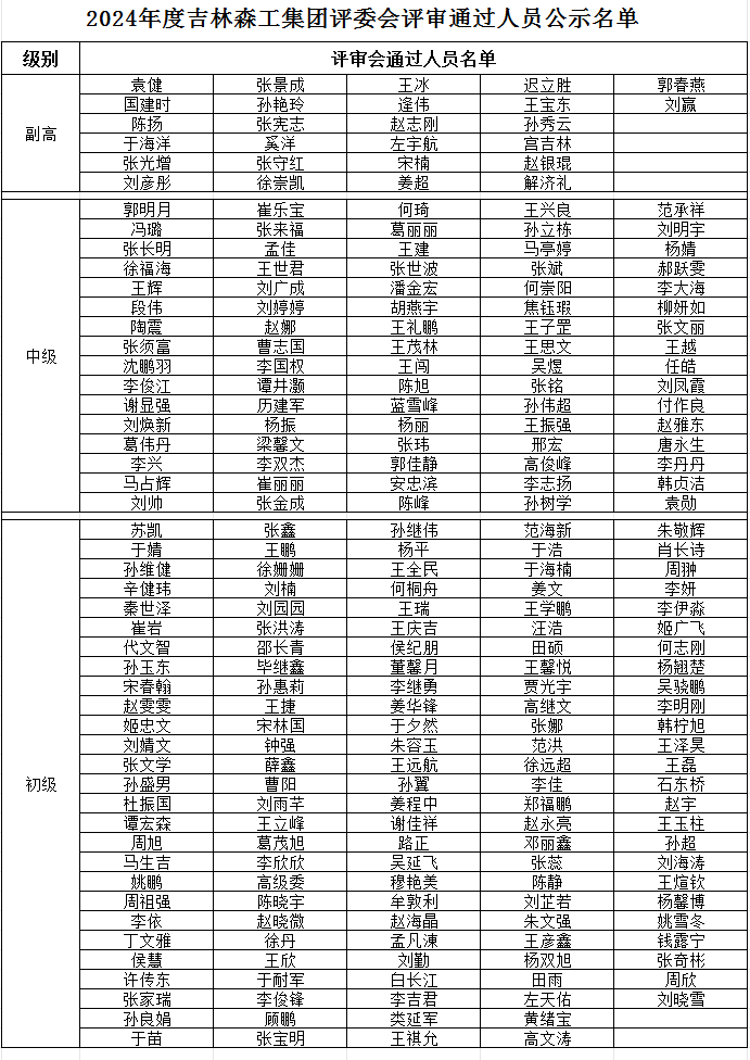 按照《吉林省2024年度职称安排部署意见的通知》文件要求,经个人报名、单位推荐、专业评委会审核等环节,确定吉林森工集团林业工程系列专业技术资格评审通过人员。现将人员名单进行公示,公示时间为2024年8月22日至8月28日。 附: 2024年度吉林森工集团评委会评审通过人员公示名单