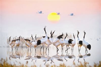 位于江苏省盐城市的中国黄(渤)海候鸟栖息地(第一期)被联合国教科文组织列入世界遗产名录。鹤鸣朝阳,摄于盐城湿地珍禽国家级自然保护区。 孙华金摄