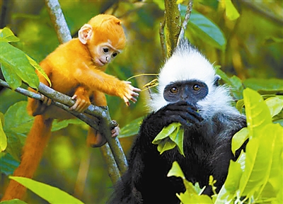 “秘境之眼”精彩瞬间——广西崇左白头叶猴国家级自然保护区内,白头叶猴食用树叶。