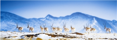 世界自然遗产地——青海可可西里保护区内藏羚羊等野生动物平静而悠闲地繁衍生息