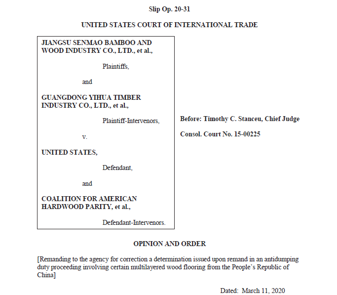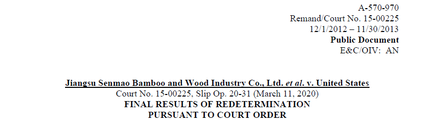 美国国际贸易法院判令文件 美国商务部于2019年6月3日做出第一次终裁修正,但只接受了法院要求的关于错误替代价格的计算问题,将江苏森茂的倾销幅度由13.74%降低到6.55%。对于美国商务部的这一做法,江苏森茂的律师团队就增值税问题继续据理力争要求法院重新开庭审理,律师团队在法庭上从法理到计算均予以强有力的抗辩。2020年3月11日,国际贸易法院将该案第二次发回美国商务部重审,再次要求美国商务部纠正其针对江苏森茂的增值税错误计算的问题。2020年5月8日,美国商务部最终接受了法院指令,纠正了其错误从江苏森茂出口价格中减扣增值税与出口退税之差,将江苏森茂的终裁税率修改为3.92%。在本案中,美国商务部也同时修改了参与本案诉讼的平均税率企业的税率,由原来的13.74%降为3.92%。这一税率的降低,将给美国进口商带来近8千万美元的退税或免税额。