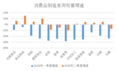 亮点二:消费品制造业用电量持续回升,“经济内循环”正在加速构建 大部分消费品制造业用电量增速由负转正,体现出国内消费稳步复苏态势。二季度,消费品制造业用电量环比增长46.1%;同比下降1.3%,降幅较一季度收窄18.6个百分点。其中,6月消费品制造业用电量实现正增长,同比增加1.9%;部分行业用电量大幅回升,甚至达到两位数增速。例如,主要立足于国内市场的食品制造业、饮料制造业、家具制造业和烟草制造业分别同比增长18.1%、10.0%、10.0%和8.2%。从短期看,尽管“中国工厂”受外需疲软拖累,但是随着生产生活恢复、跨省旅游解禁,国内消费已呈现出稳步复苏态势。从长期看,众多百年老店和新锐品牌都在深耕本土市场,合力打造“新国货”。新一轮消费浪潮的兴起,将推动我国“经济内循环”加速构建。  图3 消费品制造业用电量季度增速对比