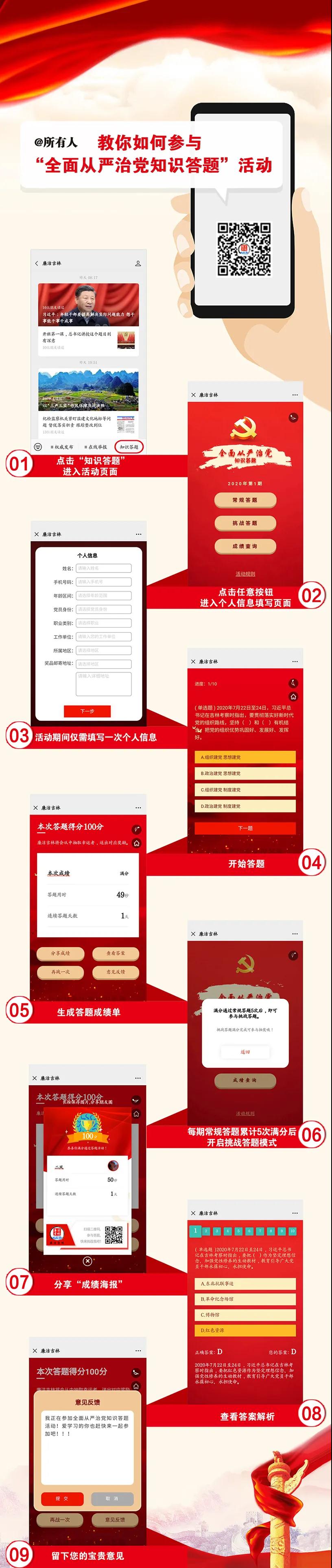 全面从严治党知识,你了解多少?动动手指,打开“廉洁吉林”微信公众号,来试试吧! 省纪委监委组织开展的“全面从严治党知识答题”活动在10月12日正式启动。此次活动面向全省广大党员干部和公职人员,重点考察四个方面内容:一是习近平新时代中国特色社会主义思想,重点是习近平总书记全面从严治党重要论述、习近平总书记视察吉林重要讲话重要指示精神等;二是党中央重大决策部署和重要会议精神;三是党内法规知识,包括《中国共产党章程》《中国共产党廉洁自律准则》《中国共产党纪律处分条例》《中国共产党党内监督条例》《中国共产党问责条例》;四是宪法法律知识,包括《中华人民共和国宪法》《中华人民共和国监察法》《中华人民共和国公职人员政务处分法》。 此次知识答题活动将于11月15日结束。在此期间,“廉洁吉林”微信公众号连续5周,每周推出1期“知识答题”活动在线答题栏目,包含常规答题和挑战答题两种模式。