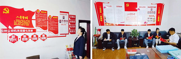 为进一步推进党建工作制度化规范化,不断提升机关党组织的号召力、凝聚力、战斗力和创造力,松林公司机关党委组织机关各党支部根据实际情况,因地制宜,在办公区域合理利用空间精心打造党建文化墙。