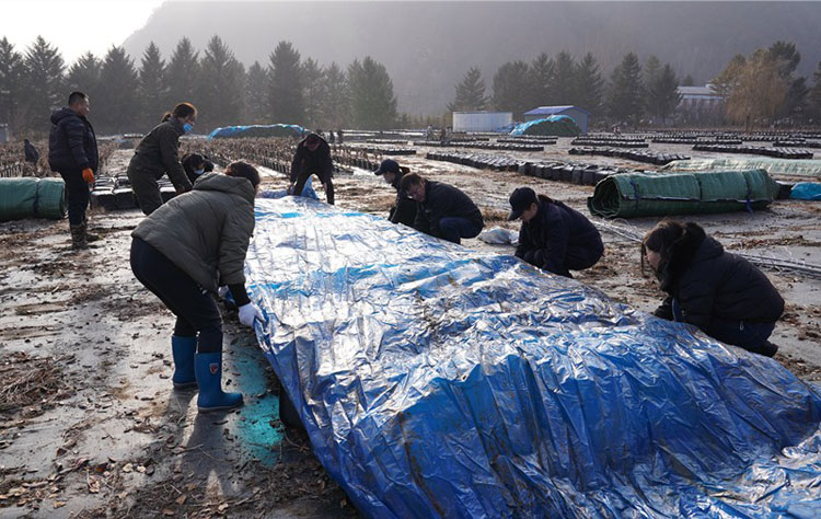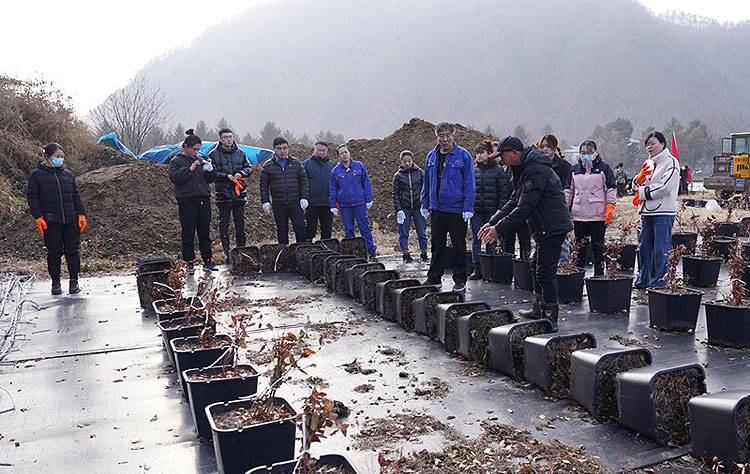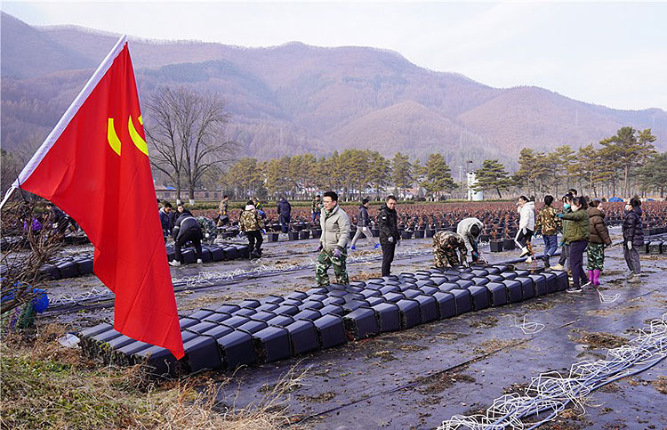 “大家一定要按照每100盆基质蓝莓以5x20的方式整齐地排列在一起,摆放好后覆上塑料薄膜,并用特制的‘棉被’盖好。注意在摆放时不要折断枝条,覆膜时不要留有空隙……”参加作业的党员干部们按照技术人员的现场指导和要求,分工合作、密切配合,有的负责运送,有的负责摆放,有的负责为摆放好的蓝莓盆栽覆膜、盖被。经过近2个小时的辛勤劳动,完成了10000盆基质蓝莓的越冬防寒工作。