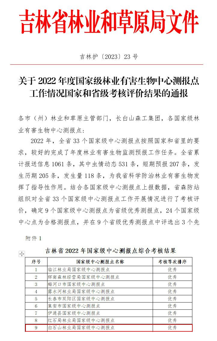 近日,在省林草局关于2022年度国家级林业有害生物中心测报点工作情况国家和省级考核总结评价中,白石山林业有限公司森林病虫防治检疫站国家级中心测报点榜上有名,被评为吉林省2022年度优秀测报点。