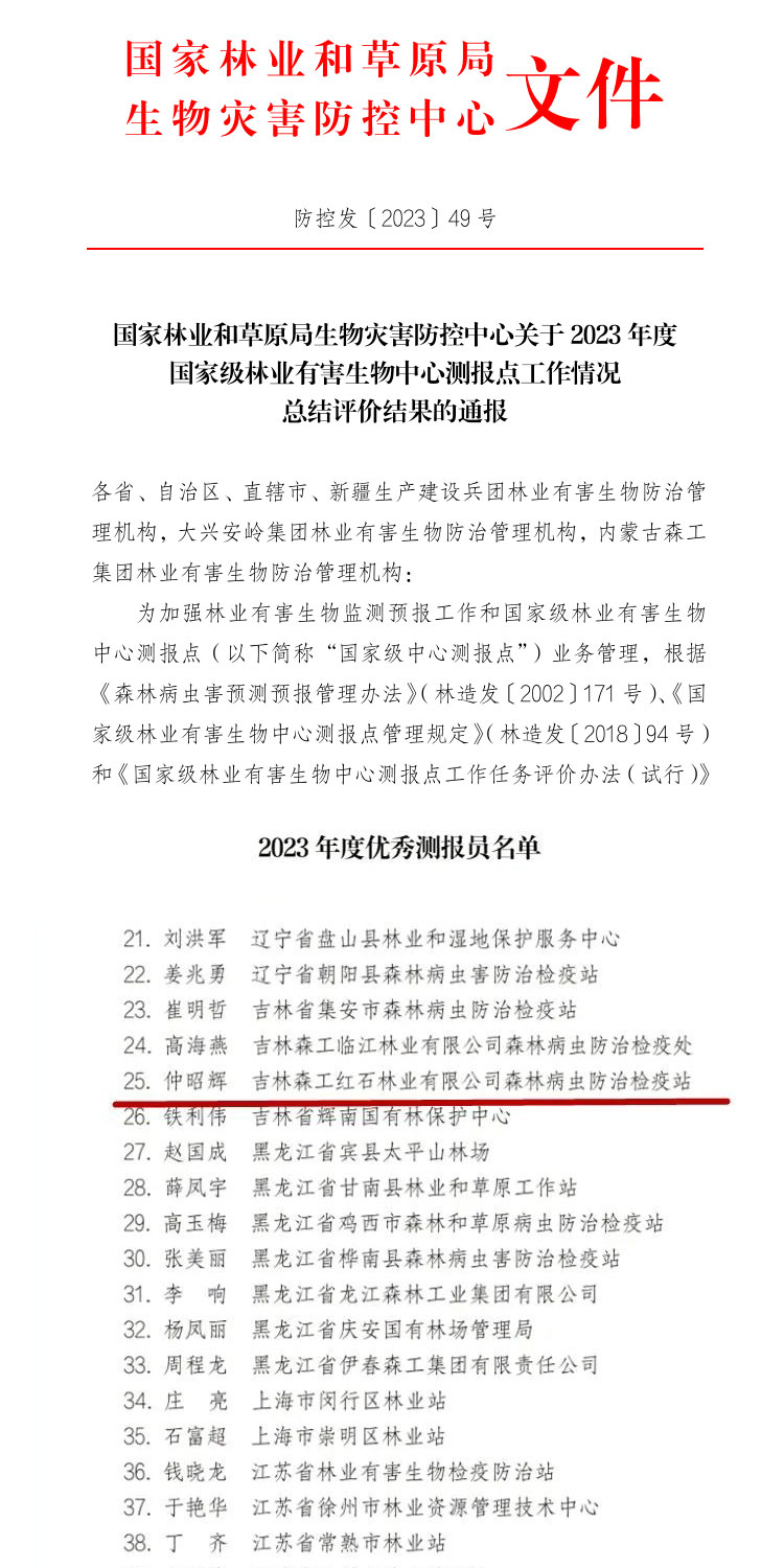 日前,国家林业和草原局生物灾害防控中心发布《2023年度国家级林业有害生物中心测报点工作情况总结评价结果的通报》,红石林业公司森林病虫防治检疫站职工仲昭辉喜获2023年度“优秀测报员”荣誉称号。