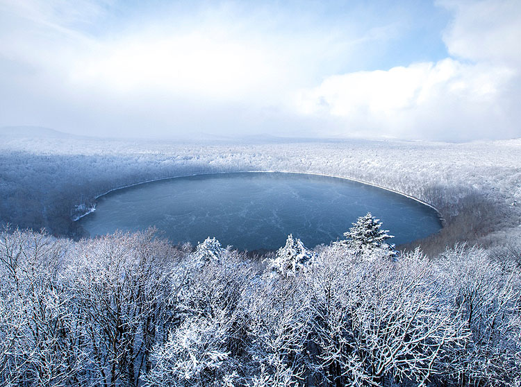 据吉林森工三岔子林业有限公司相关负责人介绍,龙湾玛珥湖景区湖面面积约42公顷,湖内水量常年基本不变。龙湾玛珥湖景区主要景观龙湾湖,湖面海拔800米,是第四纪晚期火山运动形成的典型玛珥湖,湖面近似圆形,水域最深处约53米,在冬日里,微风吹拂着雪花在龙湾湖湖面上飘飘洒洒,宛如一幅绝美的山水画卷,仿佛置身于仙境一般。