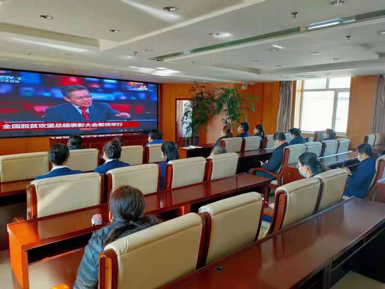 康养集团长白山大厦党员干部观看直播 习近平总书记在总结表彰大会上庄严宣告,中国脱贫攻坚战取得了全面胜利,现行标准下9899万农村贫困人口全部脱贫,832个贫困县全部摘帽,12.8万个贫困村全部出列。这是多么振奋人心的数字!这是中国人民的伟大光荣,是中国共产党的伟大光荣,是中华民族的伟大光荣!