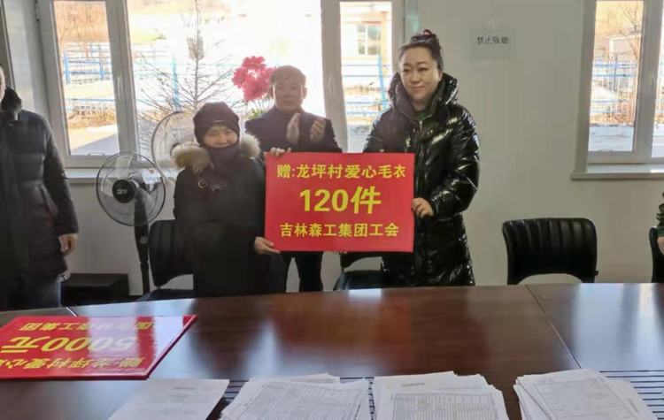 吉林森工集团工会副主席田敖琼代表集团公司工会向龙坪村“爱心超市”捐赠爱心毛衣