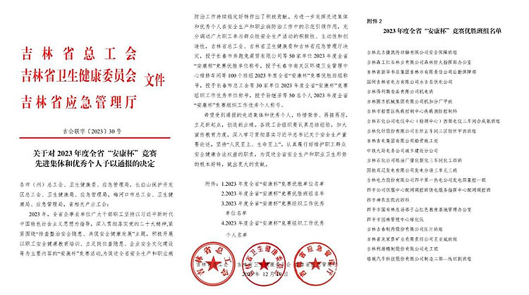 近日,吉林省总工会、吉林省卫生健康委员会和吉林省应急管理厅联合下发《关于对2023年度全省“安康杯”竞赛先进集体和优秀个人予以通报的决定》,授予红石林业公司森林防火指挥部办公室2023年度全省“安康杯”竞赛优胜班组称号。