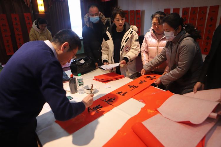 春联内容既有辞旧迎新的美好愿景,也有展示经济繁荣、大展宏图的励志高歌,一幅幅精彩的书法作品,一句句吉祥如意的春联写出了对新年的期盼,也描绘了大家对新年美好生活的憧憬。活动大厅内布满了春联,成了一片红色的海洋。经过4个多小时的创作,书法家们共送出春联1200余幅,福字2200多个。