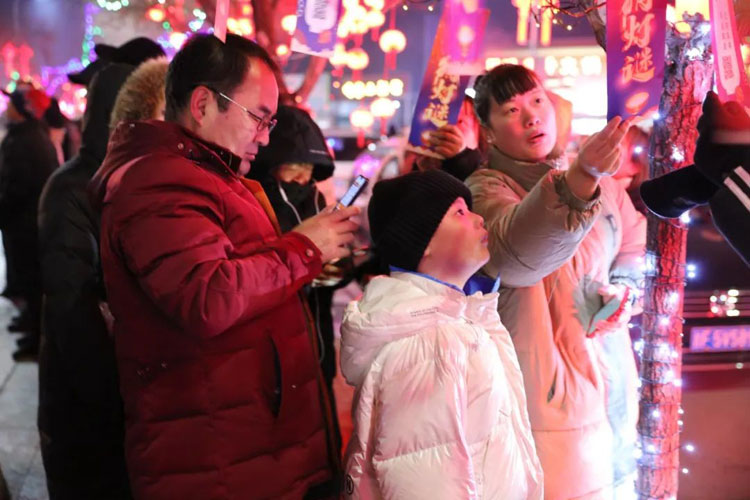 灯月交光照绮罗 元宵无处不笙歌 傍晚时分,身着艳丽服饰的数支民间秧歌队伍已在广场摆开阵势,伴着激越高亢的唢呐、铿锵有力的锣鼓韵律欢天喜地舞动起来。 林区吉祥物“蛙蛙”也来到了现场。穿着节日盛装的东北“小冻梨”们或追逐“蛙蛙”嬉戏,或与“蛙蛙”合影,粉嫩的小脸蛋在节日彩灯的映衬下显得格外幸福。 工作人员在缀满五颜六色彩灯的绿化树上挂上了内容丰富、寓意深刻的灯谜条。“这是今年的工作报告内容,这是咱们当地的地名,这是工会互助保险的内容……”大家或专注凝思,或相互探讨。猜中者喜得红包,兴趣倍增;猜错者也不气馁,再接再厉。很快,500余条兼具娱乐性和知识性的字谜、俗语、楹联、诗词、科普、旅游、成语、企业管理知识谜面被一扫而空。