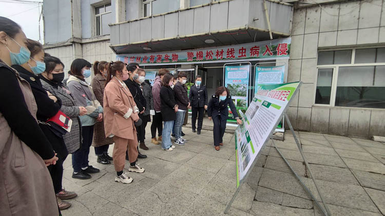活动中,临江林业局森防检疫站工作人员身着检疫制服,在森林经营培育中心门前广场布设了宣传板,向青年干部员工们展示讲解了美国白蛾、松材线虫病等检疫性有害生物防治工作现状、危害症状和防治措施,并引领青年员工到临江林业局长白山生物标本室进行参观学习。