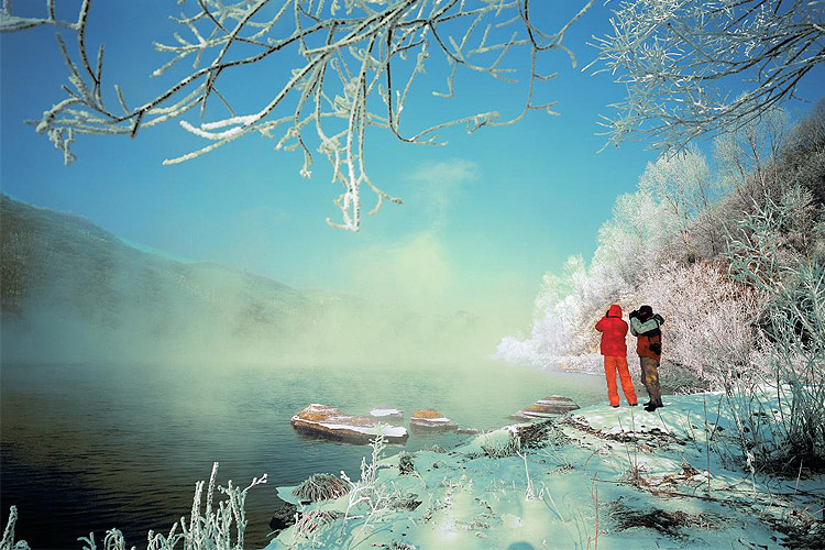 形成雾凇要具备足够的低温和充分的水汽,这两个自然条件极为苛刻而又互相矛盾。而建1958年的亚洲第一地下水电站白山电站和始建于1982年的红石水电站正好营造了这样独特的气象环境:滴水成冰的严寒季节,湖面结了厚厚的坚冰,从白山湖、红石湖大坝底部经过水轮机流出的水却在零度以上,于是有了不冻的松花江源源流过红石林区。江水向空气中蒸发大量的水汽,巨大的温差使水汽遇上沿江的树木凝华成晶莹剔透的雾凇,但是轻微的温度、风力的变化都会给它带来致命的影响。所幸的是,红石林区属于高寒山区,冬季最低气温平均在零下22度,最低温度值零下40度左右,这种独特的气候条件,给红林雾凇的形成创造了有利的条件,于是这里的人们不用像吉林那样苦盼数日也难觅芳容。进入冬季后,只要温度在零下20度左右,人们便天天可以领略到:“百里林海百里淞,沐浴松水一腔情,穿云拨雾舞倩影,傲雪怒放唱大风”的唯美意境。更为难得的是,在千里冰封的北国山城,乘船游览雾凇奇观时还有嬉戏的水鸟相伴,这种天人合一,人与自然和谐相处的美好画卷和得天独厚的自然美景吸引了祖国游人、异邦来客纷至沓来,络绎不绝。游人们把这里称之为让心灵净化的乐土,摄影家们把这里当作修成正果的桃花源。于是国际摄影俱乐部把创作基地放在了这里,很多电影电视艺术家,制作人把拍摄地点选在了这里。先后有《关东金王》、《激战无名川》、《小镇交警》、《河湾湾路弯弯》等三十余部电影、电视剧来红石林区拍摄,荣获飞天奖一等奖的电视连续剧《静静的白桦林》,就是在这里拍摄的。 |