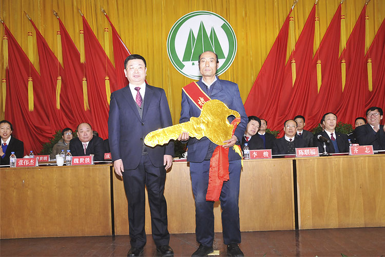 赵希海的儿子赵景春接过楼房的钥匙 郑晓然 摄 “从伐木劳模到育林英雄,27年的无私奉献,绿了荒山,白了头发;清了溪水,驼了脊背。汗水、泪水和苦水相偎依,誓言因此崇高而庄严。您是吉林森工的一面旗帜,大山深处的一座路标。”1月28日,在吉林森工红石林业局的职工代表大会上,赵希海获得了年度特别贡献奖,给他的奖励是局址地区一套53平方米的新房。 赵希海是红石林业局批洲林场的一名退休工人,已年近八十。 1989年退休后,他在林场周边的荒山荒地、林间空地义务植树18万多株,成活11万多株,全部无偿献给了国家。赵希海决定在有生之年再为国家育苗100万株。由于多年积劳成疾,他患上了脑血栓。病中的他初衷不改,病情稍有好转又重新投身苗木培育,现已累计为国家捐献优质树苗80余万株。 赵希海的感人事迹引起了全社会的强烈反响,老人先后被评为“感动吉林”人物、“中国绿色年度”人物,并荣获“国土绿化突出贡献奖”。 为了方便育苗,赵希海一直住在批洲林场的平房内。前不久,他脑血栓再次发病,术后行动困难,日常生活行动极为不便。经红石林业局领导班子集体讨论,一致决定在局址奖励赵希海一套楼房。局长、党委书记刘波说:“老人为企业作出巨大贡献,我们有责任、有义务照顾好老人的晚年生活。”