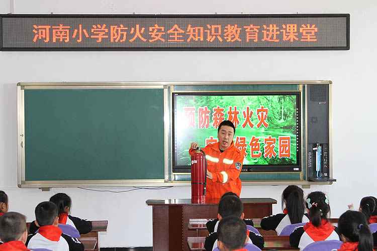 在学校三楼的电教室,河南小学全校师生共同参加了“防火安全知识教育进课堂”主题班会。班会上,全校师生共同学习了森林防火相关知识,观看了森林防火宣传幻灯片。该校教师以图文并茂的PPT课件为载体,通过课堂互动等方式向学生们讲述了森林火灾的危害性和不确定性,“我们能为预防森林火灾做点什么”等。防火办工作人员示范讲解了灭火器的正确使用方法,并对学生进行了现场指导。随后,防火办还向同学们赠送了由白山市森林防火指挥部制作的《森林防火漫谈》一书。书中通过漫画的形式讲述了森林的重要性、如何预防和扑救森林火灾等内容。防火办人员与学生们现场互动,共同学习了书中的内容,巩固了防火安全知识,达到了普及森林防火知识的目的。