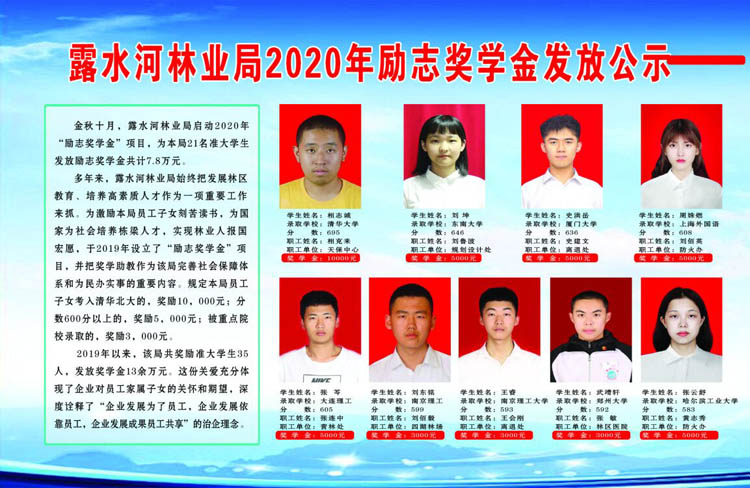 近年来,露水河林业局始终把发展林区教育、培养高素质人才作为一项重要工作来抓。在企业存在大量资金缺口的严峻形势下,为激励学子刻苦读书,为国家为社会培养栋梁人才,实现林业人报国宏愿,露水河林业局把奖学助教作为完善社会保障体系和为民办实事的重要内容,于2019年设立了“励志奖学金”项目,规定本局职工子女考入清华大学、北京大学的,奖励10,000.00元;分数600分以上的,奖励5,000.00元;被重点院校录取的,奖励3,000.00元。