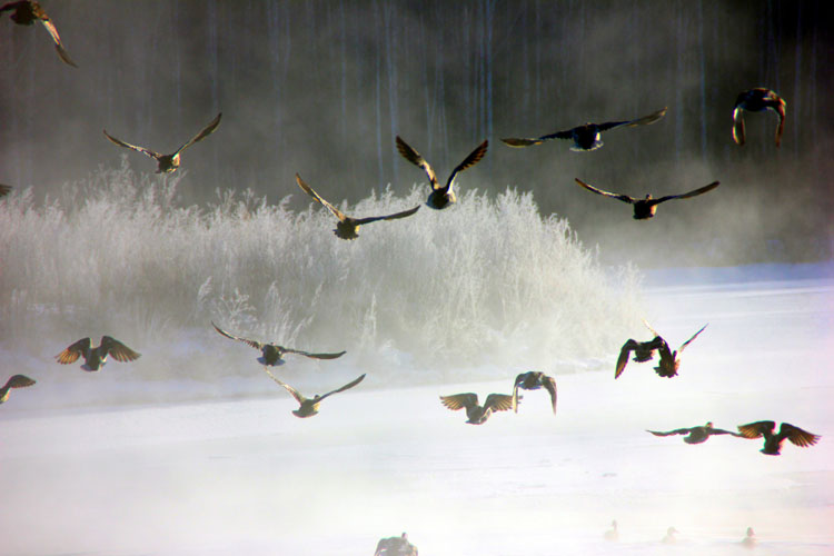 入冬至今,上百只野鸭来到露水河国家森林公园碧泉湖景区,它们三五成群,在不结冰的碧泉湖上悠然游动,时而把头伸入水中觅食,时而在水面飞舞,与白雪构成了一道自然和谐的美景。 露水河国家森林公园内的碧泉湖由地下低温矿泉汇聚而成,四季恒温。湖水中富含有丰富矿物质和适合野鸭觅食的小鱼、小虾。自2013年起,野鸭就把这里当成最理想的冬季栖息地,由最初的三五只繁衍到现在的百余只。再过两天天气回暖,它们将要飞回更适合产卵孵化的地方。 近年来,露水河林业局依托长白山区位优势,坚持保护环境、生态优良的原则,大力发展森林旅游产业,良好的生态环境使这里成为野生动物栖息繁衍的理想王国,鹿、狍子、野猪、山鸡、野兔等动物经常出没,描绘出人与自然和谐相处的美好画卷!