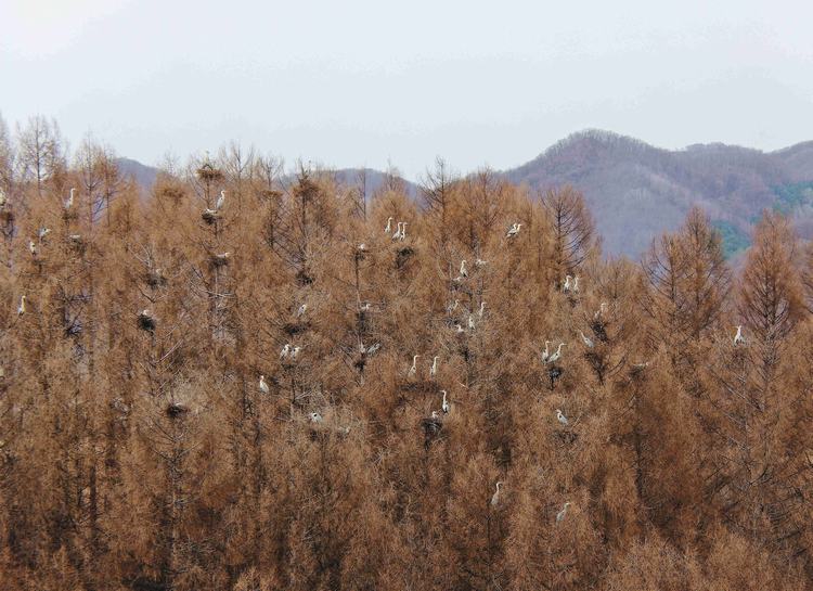 苍鹭聚集在平静的水面上或追逐觅食,或结伴翱翔,或引颈高歌,为沉寂了一冬的林区增添了无限春色,也为春天增添了勃勃生机。林区里有着丰富的森林资源,众多河流湿地,为野生动物提供了良好的隐蔽场所和生存空间。