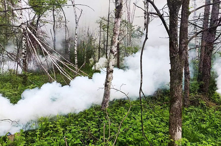 防治作业中,为最大限度提高防治效果,各林场防治人员在早晚大气出现逆温层时段,采用1.2%苦参烟碱烟雾剂开展防治作业。该烟剂对害虫具有强烈的触杀、胃毒和一定的熏蒸作用,具有低毒、低残留、无污染、残效期长、对害虫不易产生抗药性等特点。截止目前,共出动车辆27台次、人员310人次,施放杀虫烟剂10.4吨,防治面积1043.63公顷,圆满地完成2023年松毛虫防治任务。