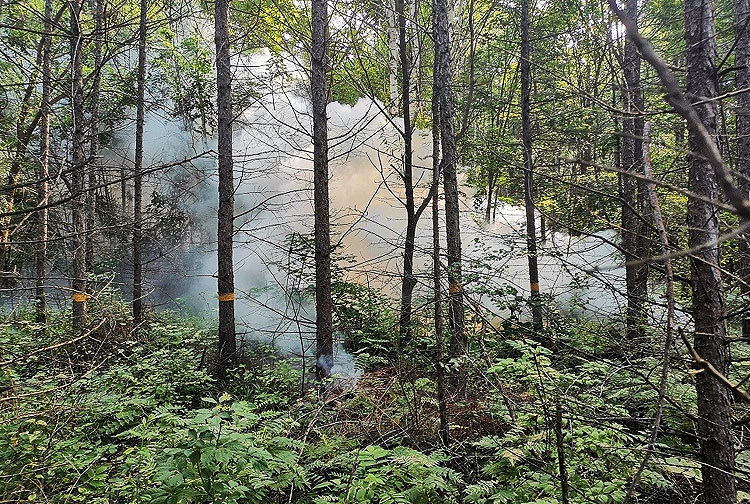 落叶松落叶病是危害落叶松正常生长的常发性病害,通过在林间施放杀菌烟剂,可有效灭除子囊孢子,降低落叶松落叶病发生概率,促进落叶松健康生长。防治中,各林场严格按照公司印发的《落叶松落叶病防治技术方案》进行防治作业,资源处检疫站工作人员对各林场烟点设置、燃放方法及撤离线路进行指导,确保防治作业达到预期效果。烟剂施放完毕后,认真清理烟剂残渣,将药箱全部收回,确保施放点无燃烧物残留。