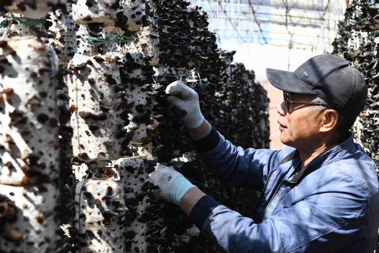 6月8日,白林公司黑木耳种植基地的大棚中,一串串菌包缀满色泽黑亮诱人的木耳,工作人员采摘着菌段上的累累硕果,脸上洋溢着丰收的喜悦。