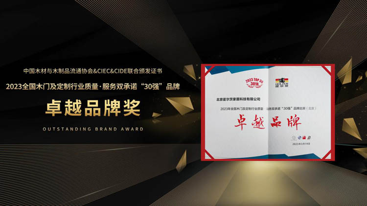 凭借企业综合实力,霍尔茨荣获由中国木材与木制品流通协会&CIEC&CIDE联合颁发的2023全国木门及定制行业质量·服务双承诺“30强”品牌——卓越品牌奖,是在连续18年获得全国市场、工程木门企业产品、质量售后服务双承诺活动单位即木门行业30强奖项后的又一有力证明。