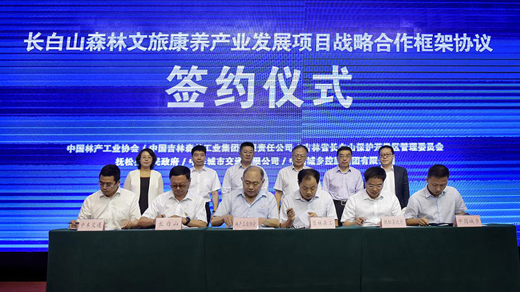 8月16日,中国林产工业协会、中国吉林森林工业集团有限公司、长白山保护开发区管理委员会、抚松县人民政府、中车城市交通有限公司、中国城乡控股集团有限公司主办的全国首家森林风景道示范项目暨长白山森林文旅康养产业发展项目战略合作框架协议签约仪式在长白山池北区举行。
