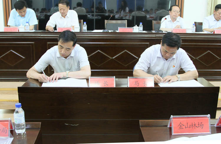 为深入贯彻落实中央、省、森工集团的决定部署,认真抓好中央环境保护督察反馈问题整改工作,进一步落实整改任务的核查和责任,按照“分级管理、分级负责”的原则和“一岗双责”的规定,陈志与全局九个林场的场长在会上分别签订了《2018年环保督察反馈问题整改责任书》;各林场场长依次对本单位中央环保督察反馈长白山林区毁林种参问题整改阶段性工作进展情况进行了汇报,并对下一步整改工作目标、任务、措施及履职尽责情况作出承诺。