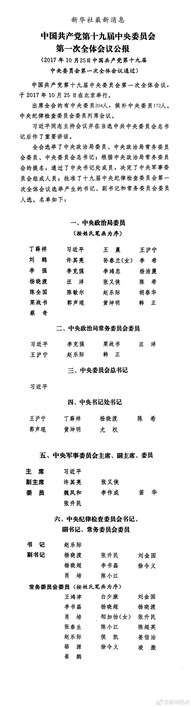 25日上午11时55分左右,人民大会堂东大厅,新一届中央政治局常委同采访十九大的中外记者见面。十九届一中全会选举产生的新一届中央政治局常委是习近平、李克强、栗战书、汪洋、王沪宁、赵乐际、韩正。