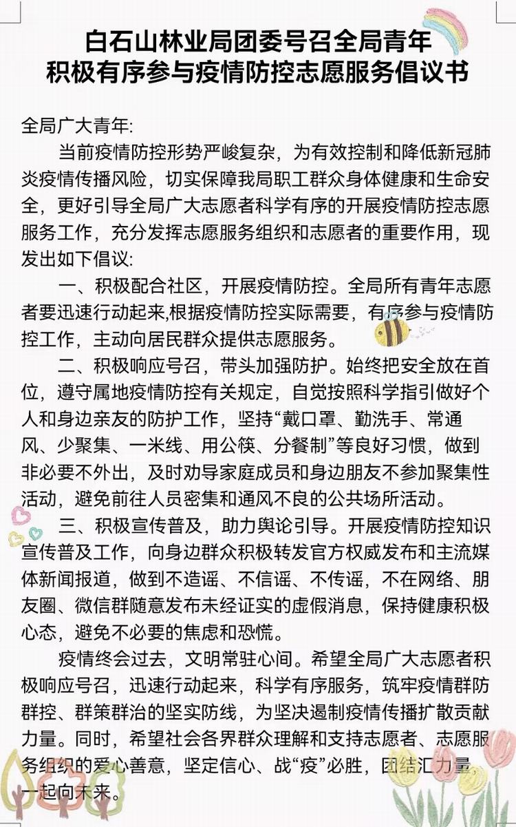 新一轮新冠肺炎疫情突然爆发,疫情防控形势复杂严峻。党有号召,团有行动,有一分热,发一分光,白石山林业局团委组织广大团干部、团员和青年志愿者立即行动起来,迅速集结、科学有序助力疫情防控工作,将青年志愿服务精神凝聚成一股磅礴的战役力量,携手筑牢疫情防线,在疫情防控工作中勇担使命、展现作为、贡献力量。