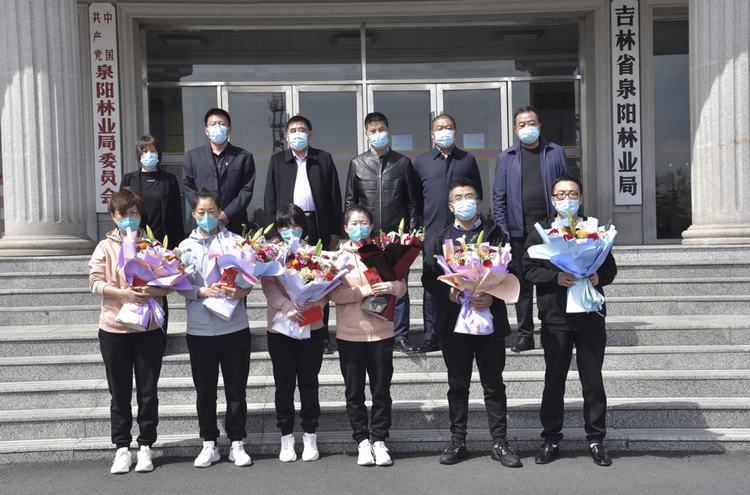 5月8日,泉阳林业局干部职工代表按照防疫规定在机关广场整齐排列,热烈欢迎林区医院战疫勇士凯旋。阮德新、王静、张鑫、战扬、季莹、张宇6名医护人员,历时35天圆满完成鲁能隔离点支援重任,经过14天休整后平安回家。